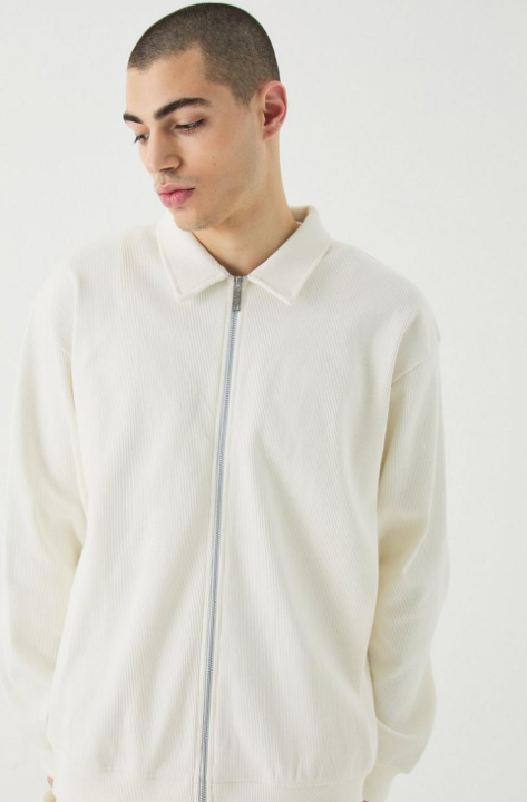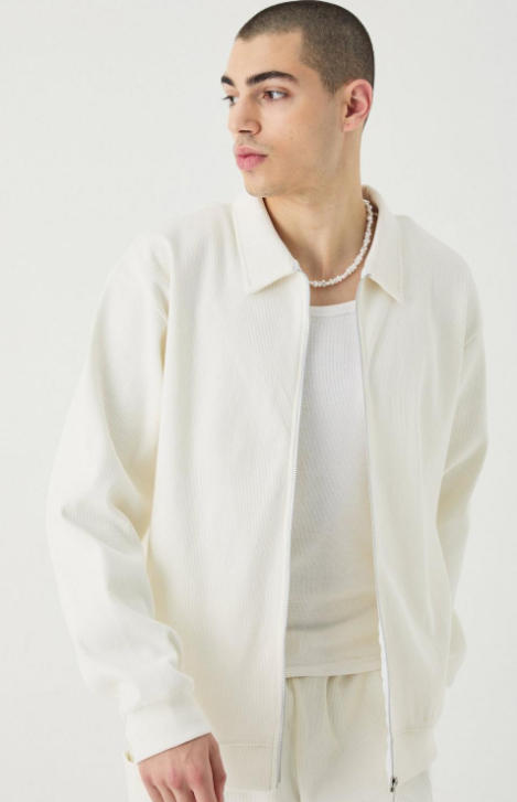 Elevate your fashion game with the BoohooMAN Oversized Heavyweight Ribbed Jacket. This stylish bomber jacket is perfect for any occasion, from a night out with friends to a casual Sunday lunch with family. Its faux leather or suede design, paired with tapered trousers and accessories, exudes a retro and edgy vibe. Plus, its brushback fabric and long sleeves will keep you warm and comfortable. Available in black, white, or beige.